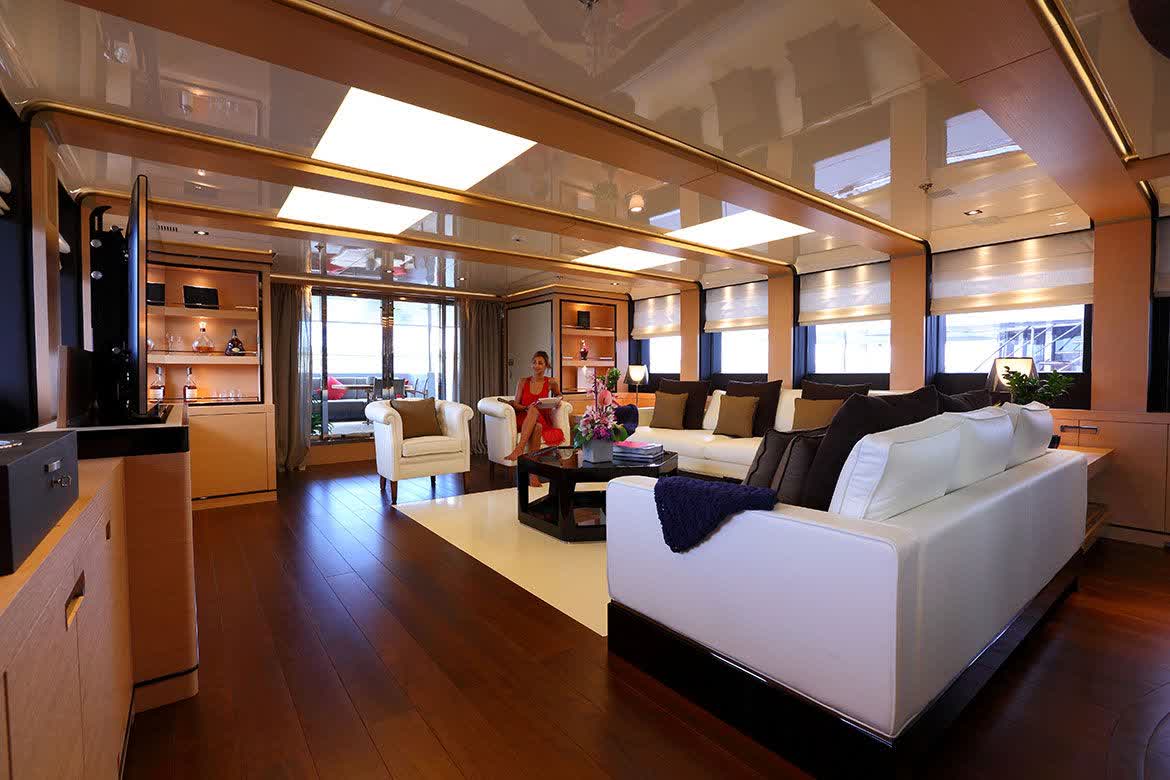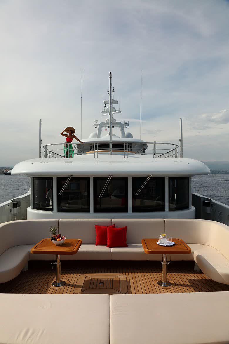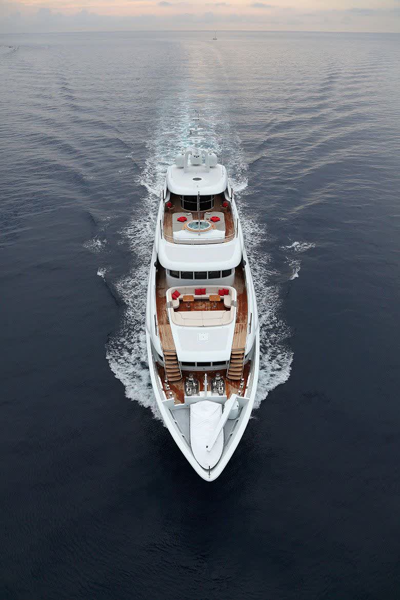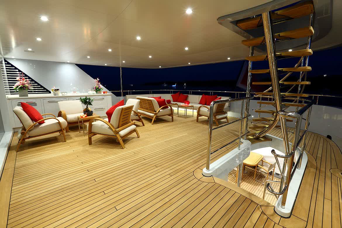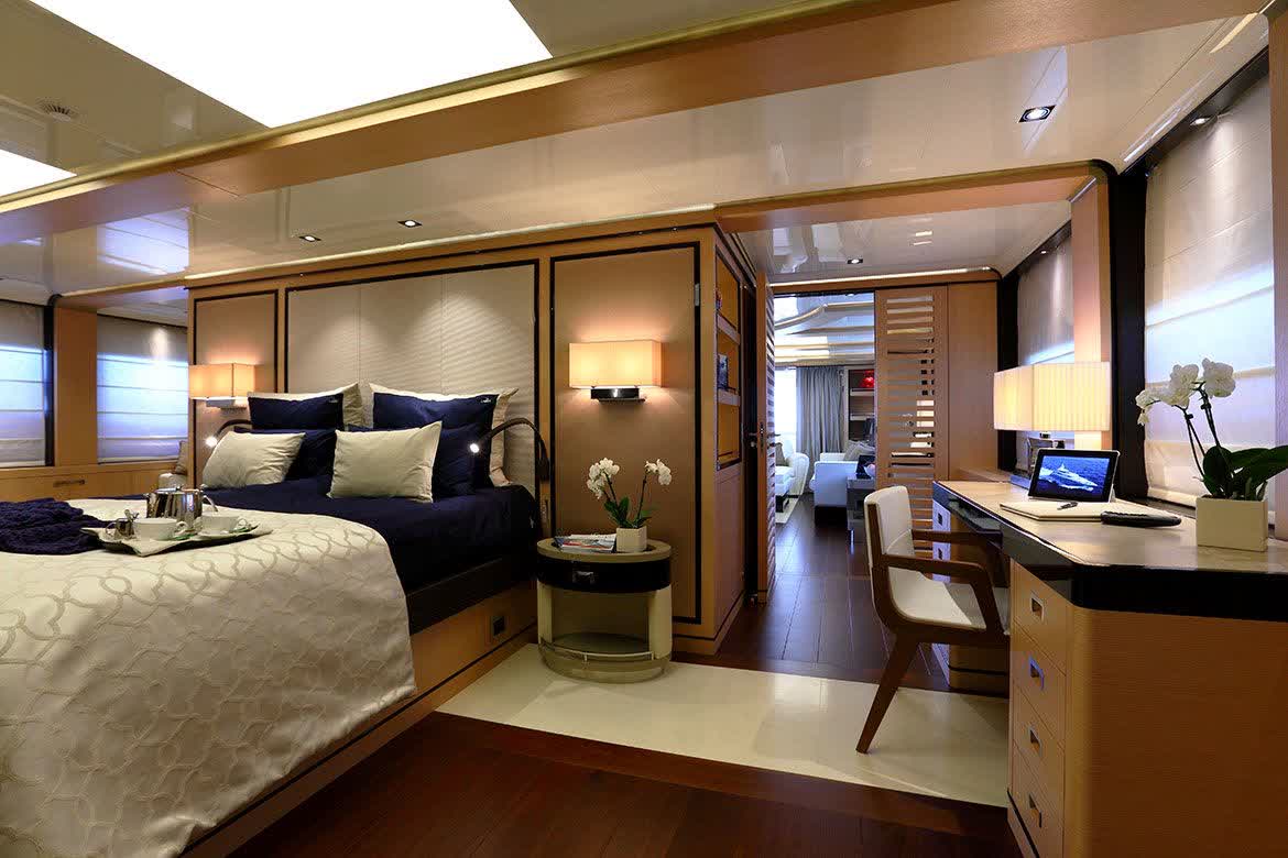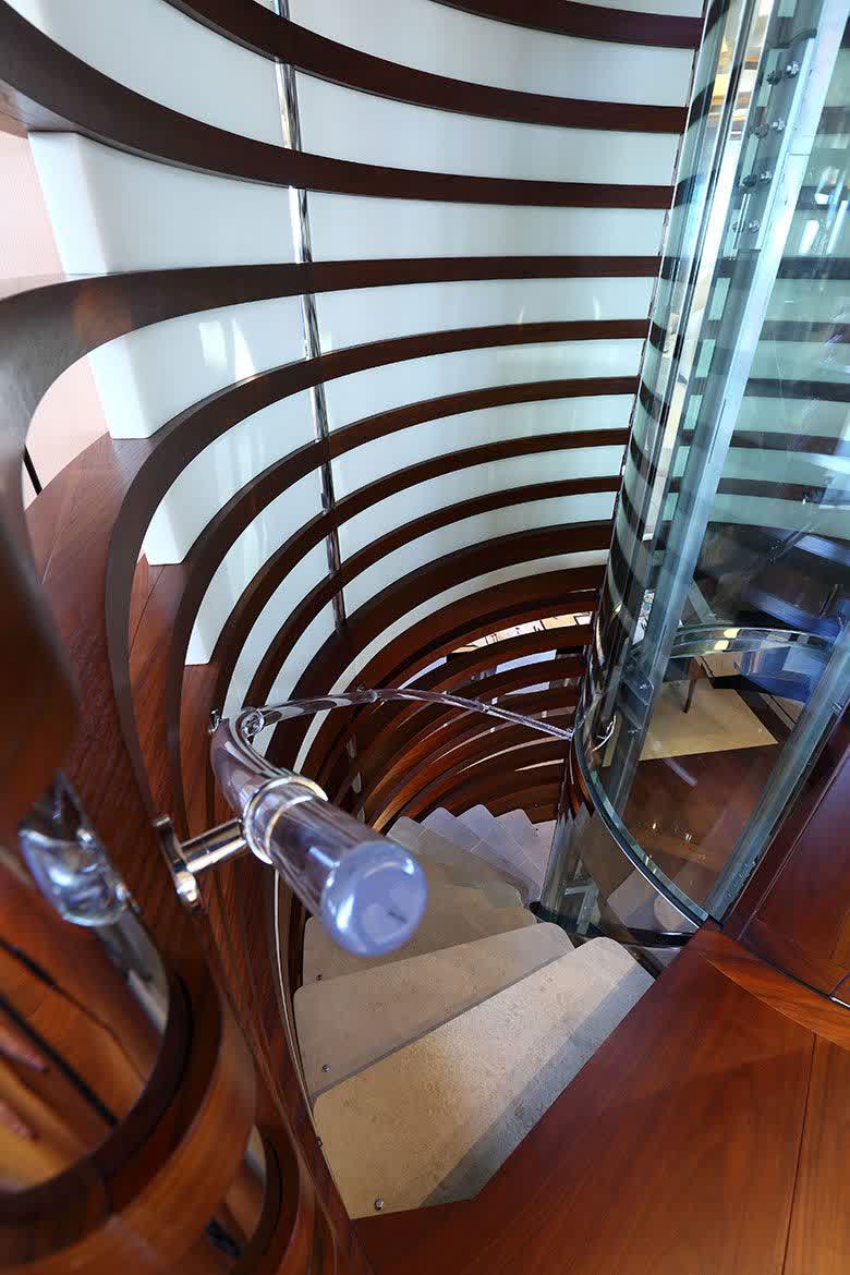 The main exposed staircase, steel, ebony and marble, which run through all of the bridges is one of the distinguishing elements that completes the contemporary style developed and conceived for this motor yacht that marks an achievement for its simple use, comfort and aesthetic beauty.