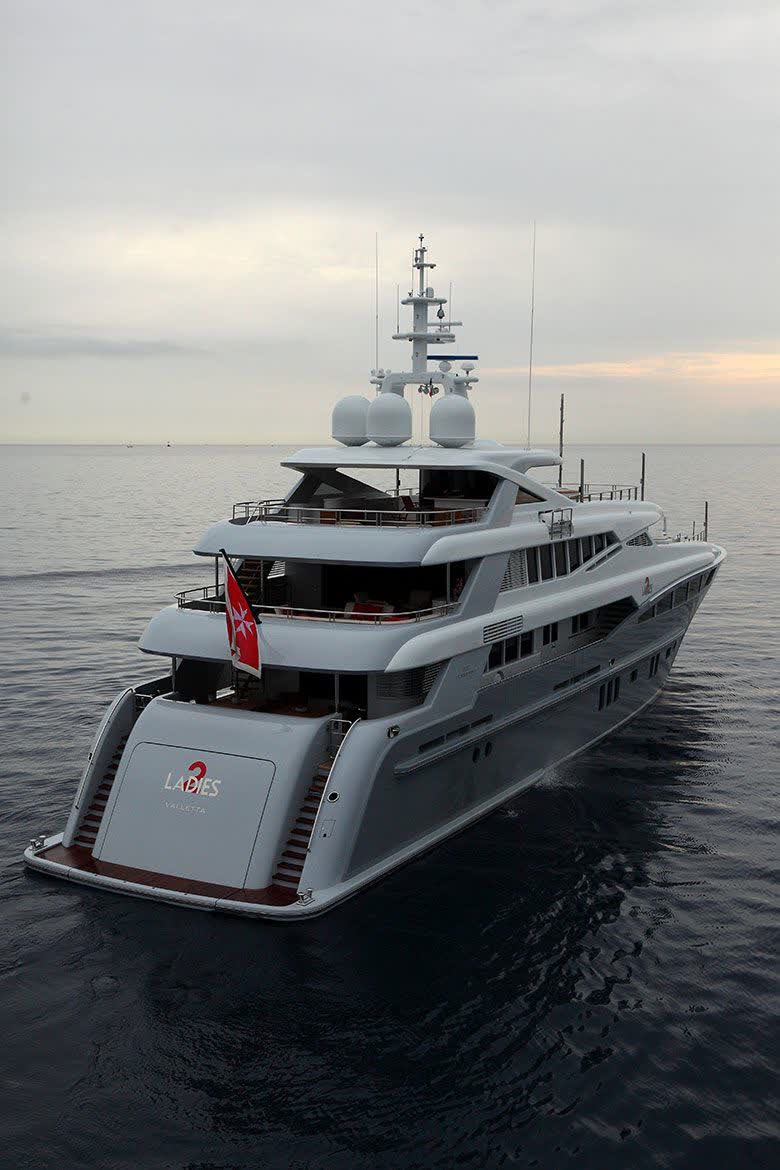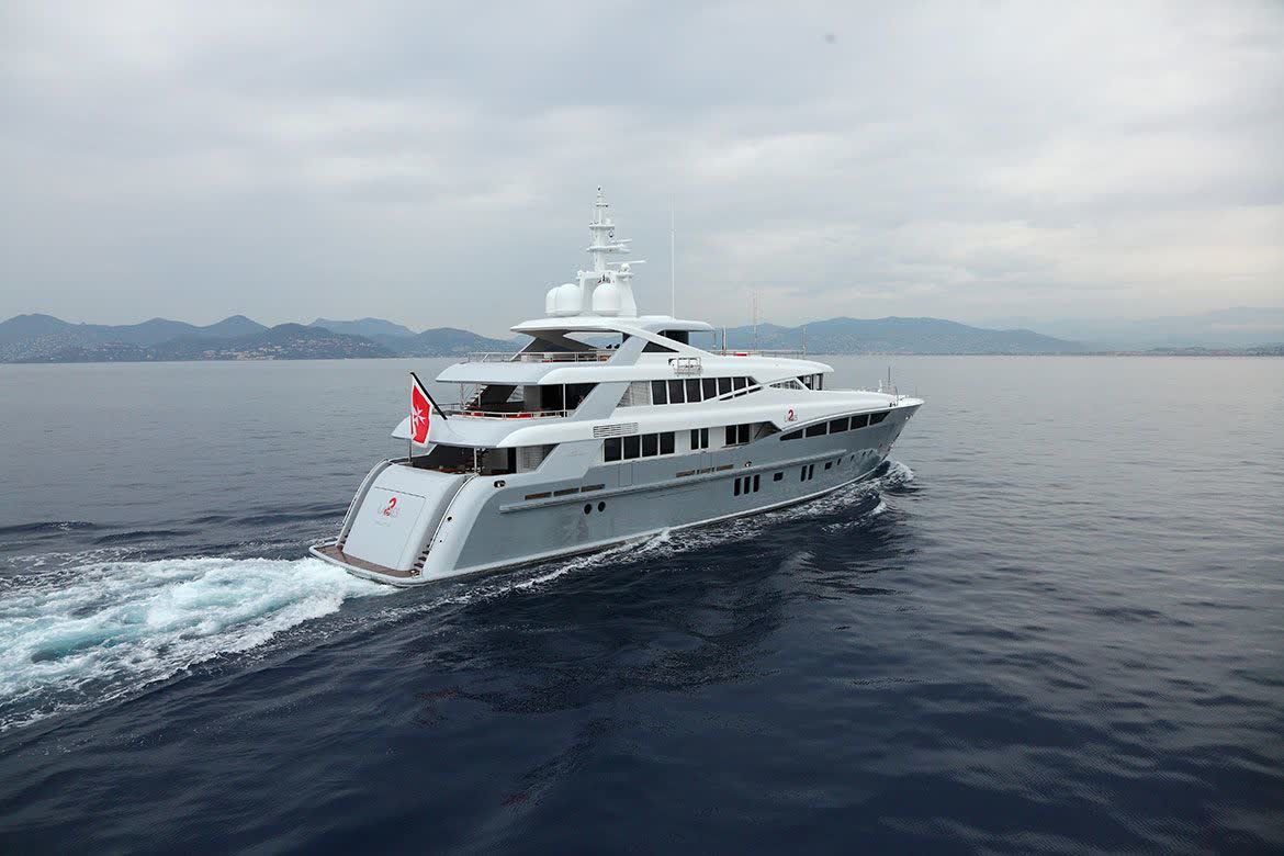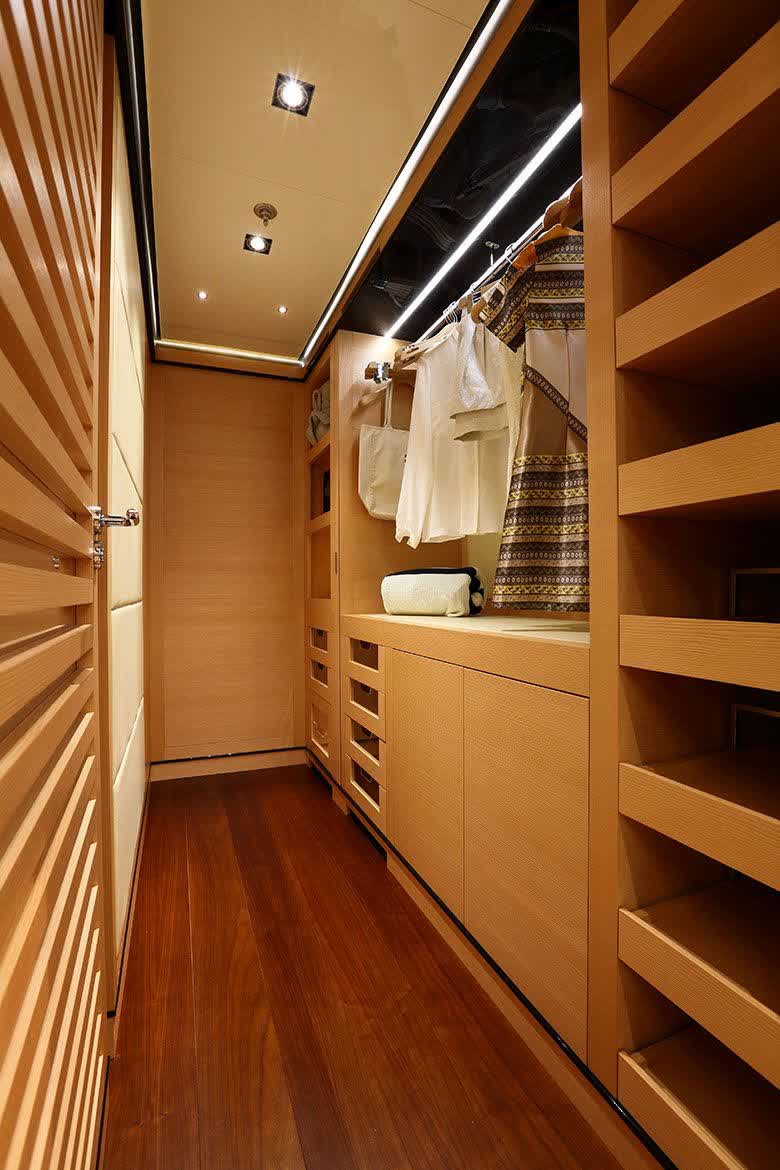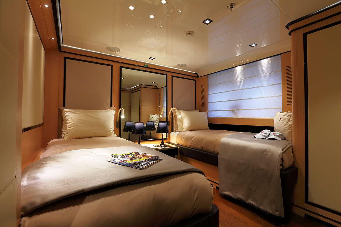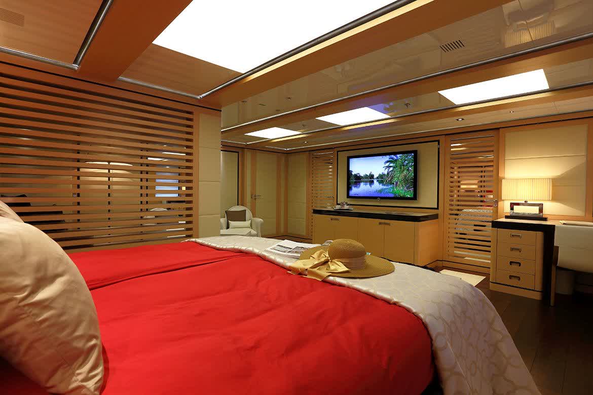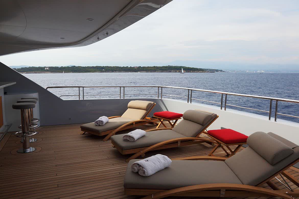 The main exposed staircase, steel, ebony and marble, which run through all of the bridges is one of the distinguishing elements that completes the contemporary style developed and conceived for this motor yacht that marks an achievement for its simple use, comfort and aesthetic beauty.