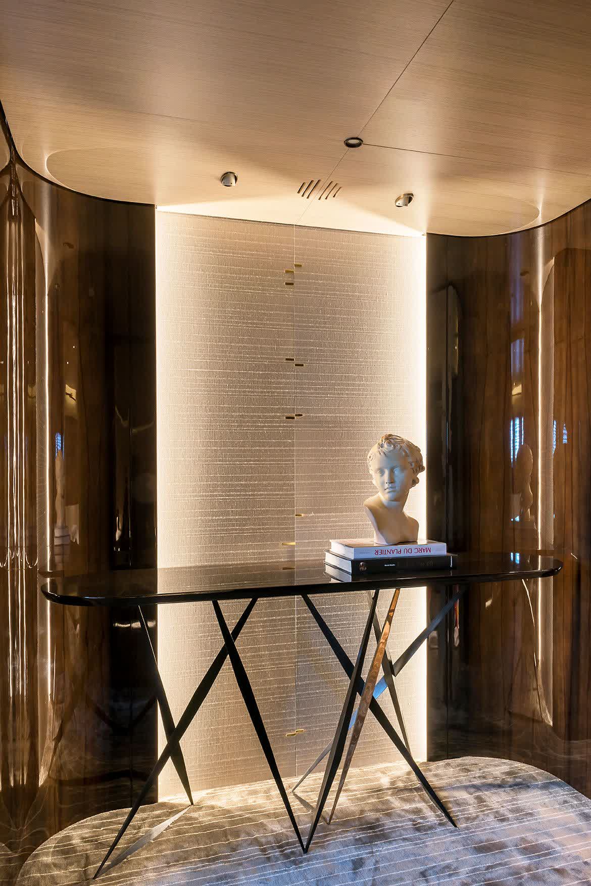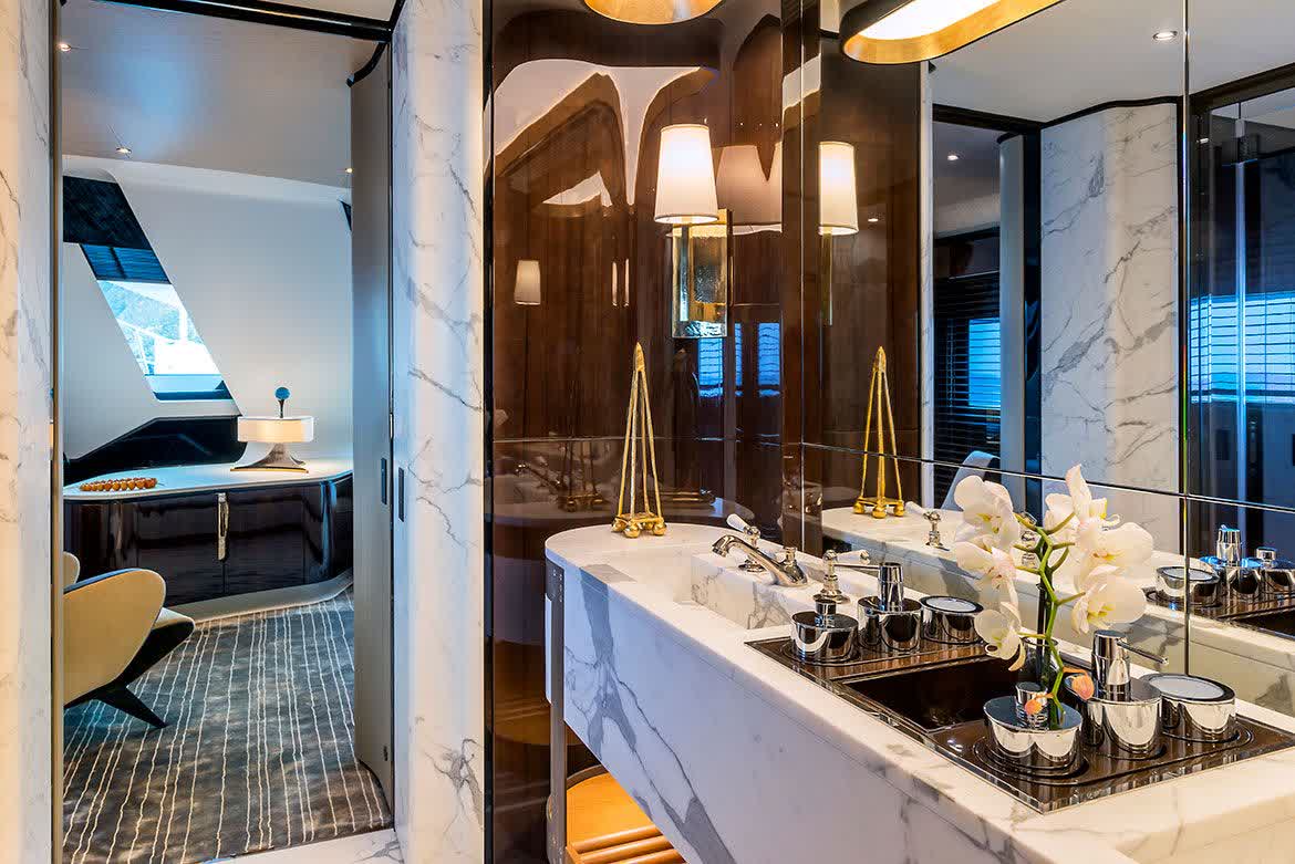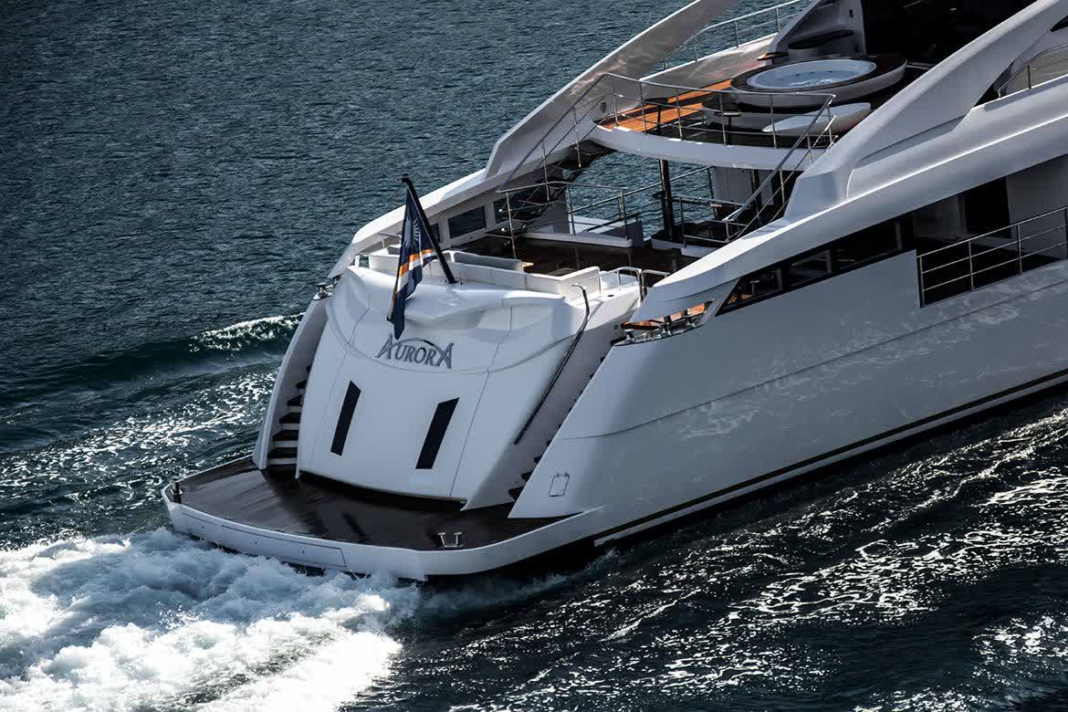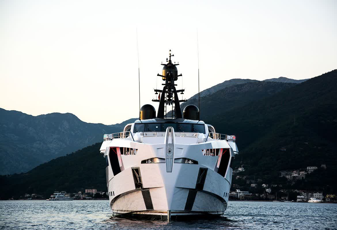 A light aluminium semi-planing hull and superstructure and twin MTU 12V4000 M93L engines with 2,580 kW power make this three-decker yacht a high-performance vessel with a speed of 23 knots. Its cruising performance is guaranteed by the Humphree Interceptors while the anti-rolling pair of stabilizers guarantee on-board comfort even when anchored in the harbour.