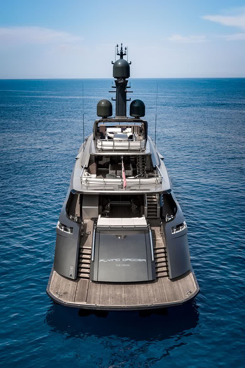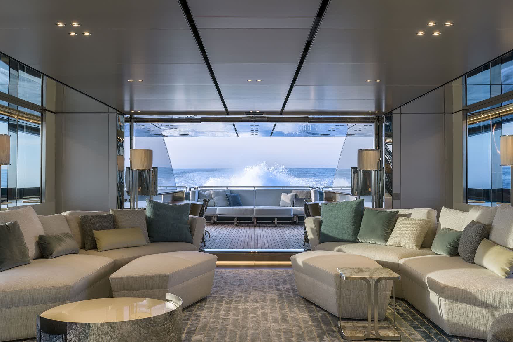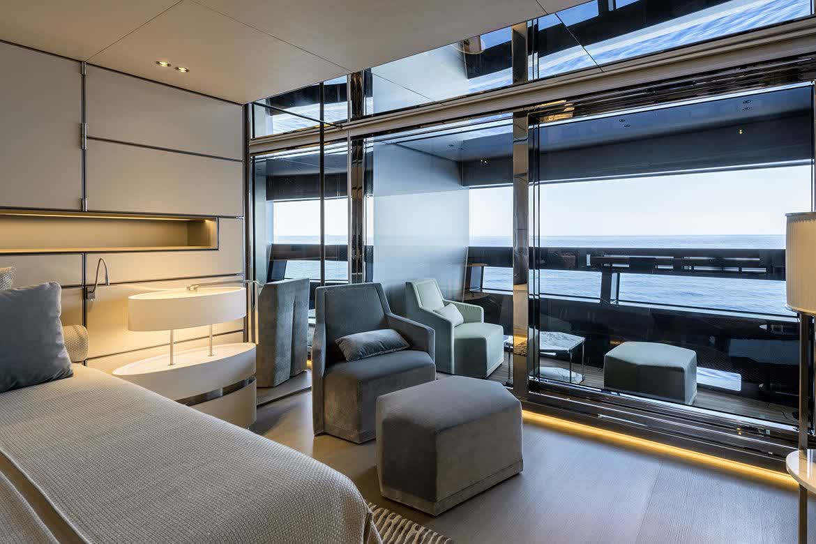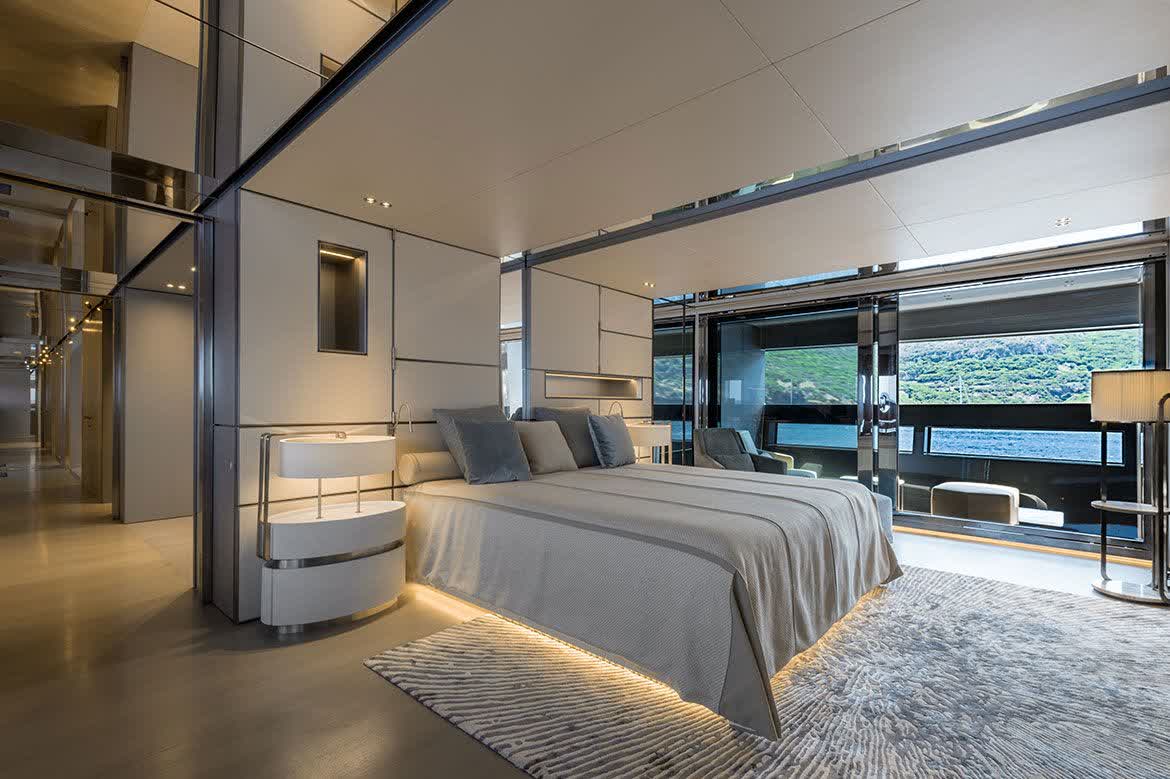With a top speed of 31 knots, guaranteed by 3 MTU engines and 3 Kamewa waterjets, this yacht contains a sport soul in a fully-aluminium structure. High standards are also ensured in terms of low noise emissions, assuring great comfort during navigation. In the interior spaces, wide windows and skylights allow to have plenty of natural light and to enjoy the panorama.