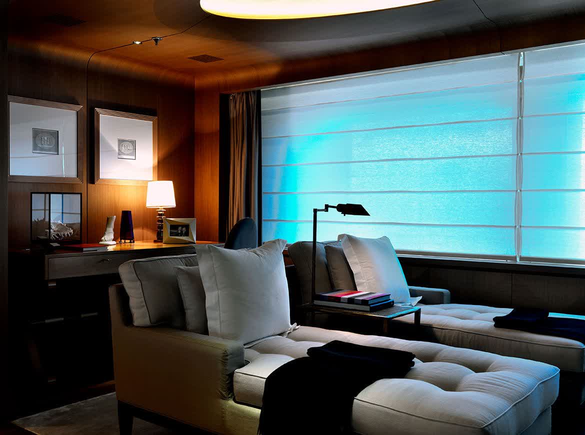 The exterior of High Power III, designed by Design Studio Spadolini, is characterized by numerous curved and continuous lines. The blue hull gently slopes down towards the stern on top of which the tiers of the superstructure elegantly lie, reminiscent of the fluid lines and flowing water of the Trevi Fountain.